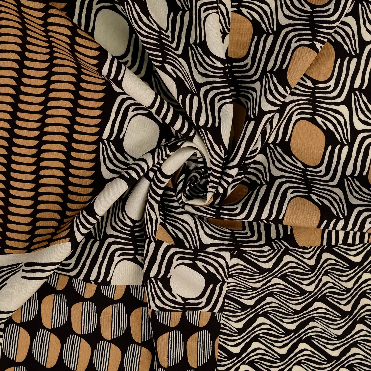 Una tela como una revista de diseño: Nuestra popelina de viscosa "Mezcla de Patrones Ecru Beige" combina formas gráficas, líneas finas y áreas modernas en una imagen estilizada. Sobre la base cálida y suave en tono ecru, bailan suaves tonos beige y marrones, acentuados por contornos más oscuros que aportan profundidad y carácter al patrón.