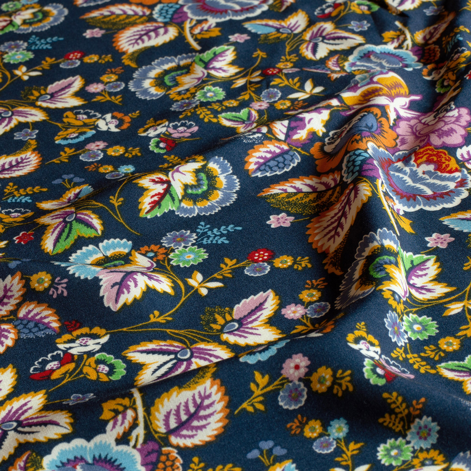 Ya sean blusas aireadas, vestidos femeninos, faldas amplias o pañuelos ligeros, esta tela aporta movimiento y ligereza a tu guardarropa. La base azul navy oscura combina perfectamente con tonos tierra apagados, crema, blanco o denim, convirtiendo la tela en un versátil todoterreno para cualquier estación.