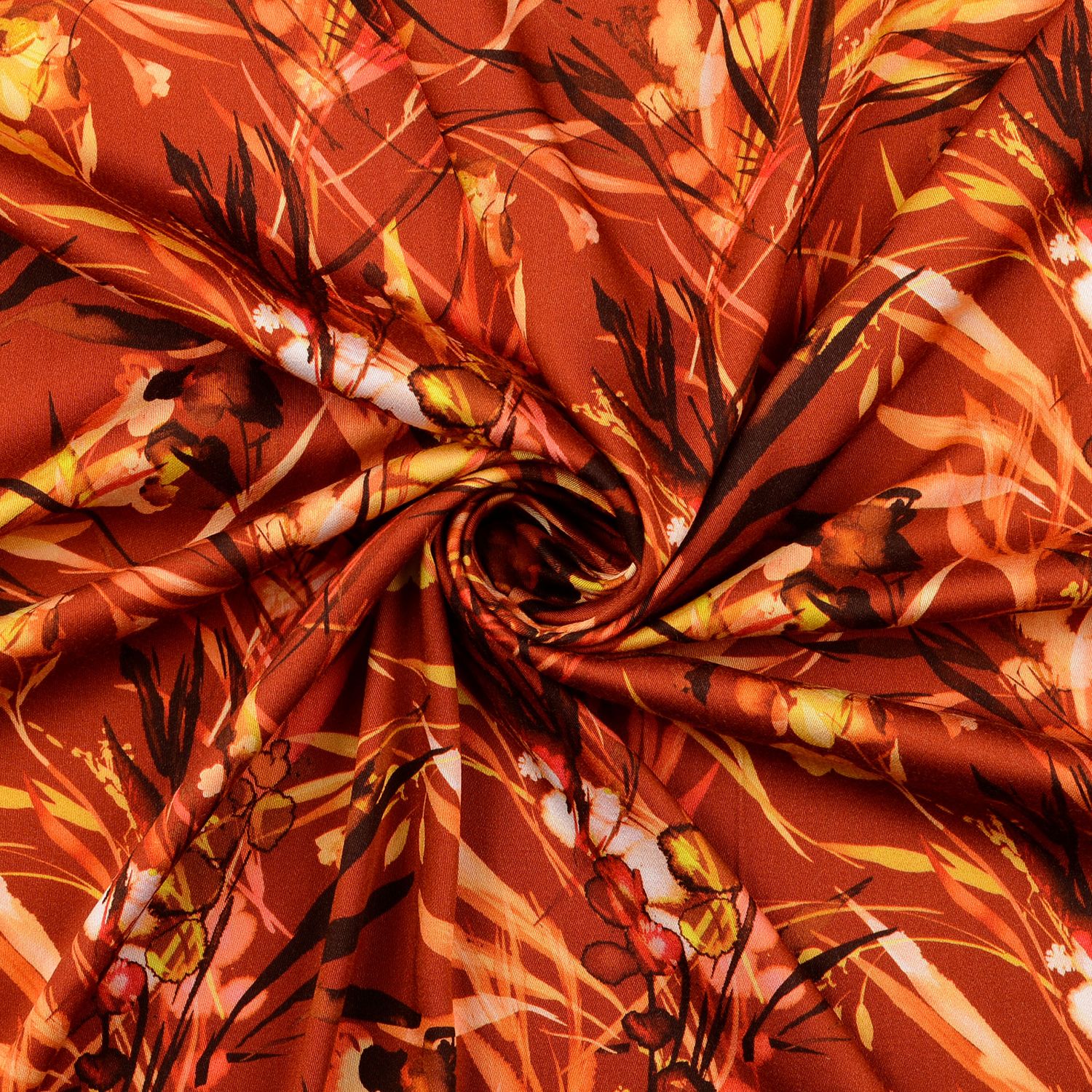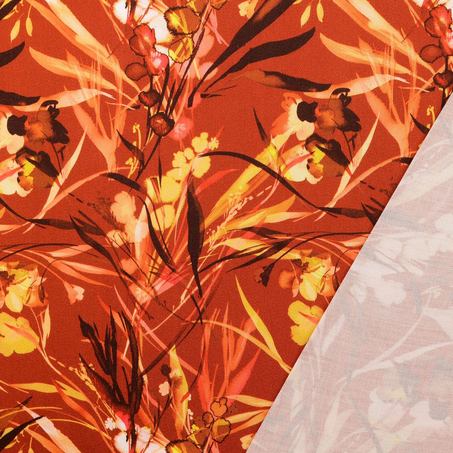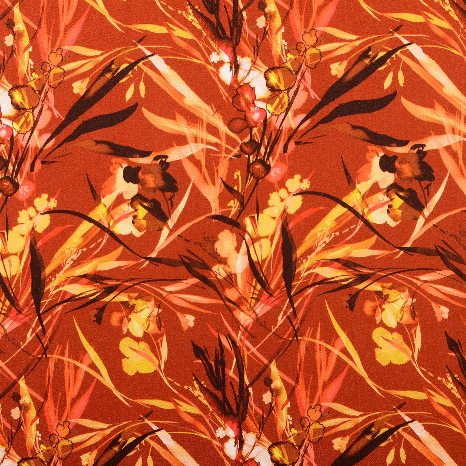 Un toque de lujo para tus proyectos de costura: Este elegante satén de viscosa seduce con una caída suave y un brillo elegante. El motivo de hojas en tonos cálidos de cobre y marrón parece inspirado en la naturaleza y destaca con mucho estilo sobre el fondo fino y ligeramente brillante.