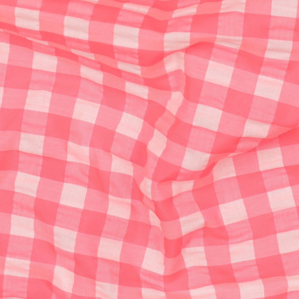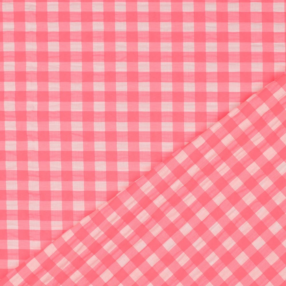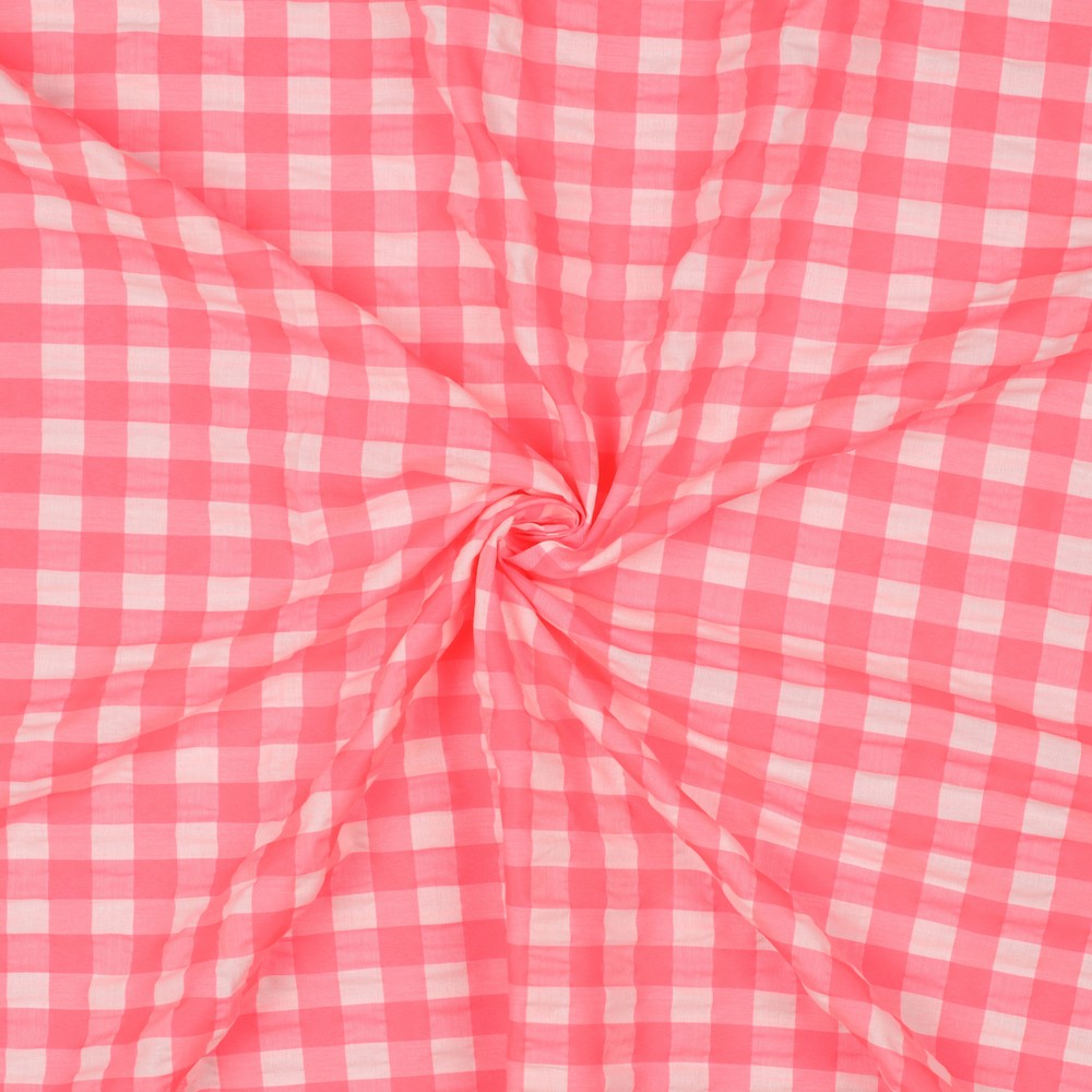 Este fresco seersucker con cuadros neón es un verdadero llamativo para todos los que aman los colores vivos y modernos. El clásico estampado de cuadros se combina aquí con colores de tendencia llamativos: un rosa brillante, un naranja jugoso, un intenso rosa coral y un intenso verde amarillo neón aportan de inmediato un ambiente veraniego. Gracias a la típica estructura ligeramente fruncida del seersucker, la tela parece viva y obtiene una bonita superficie con relieve que resalta de forma juguetona el diseño de cuadros.