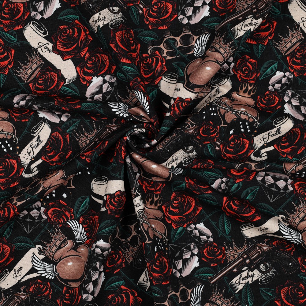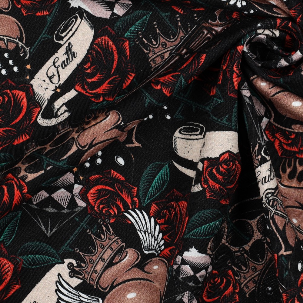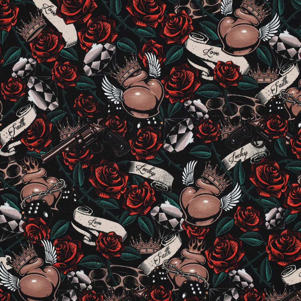 Sommersweat - French Terry estampado digital Corazones Alas Rosas Negro estructura de bucles