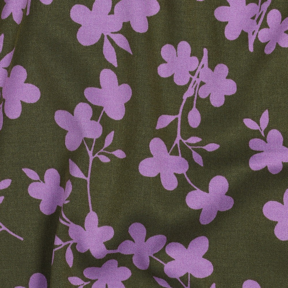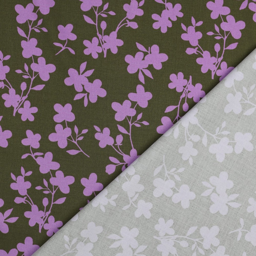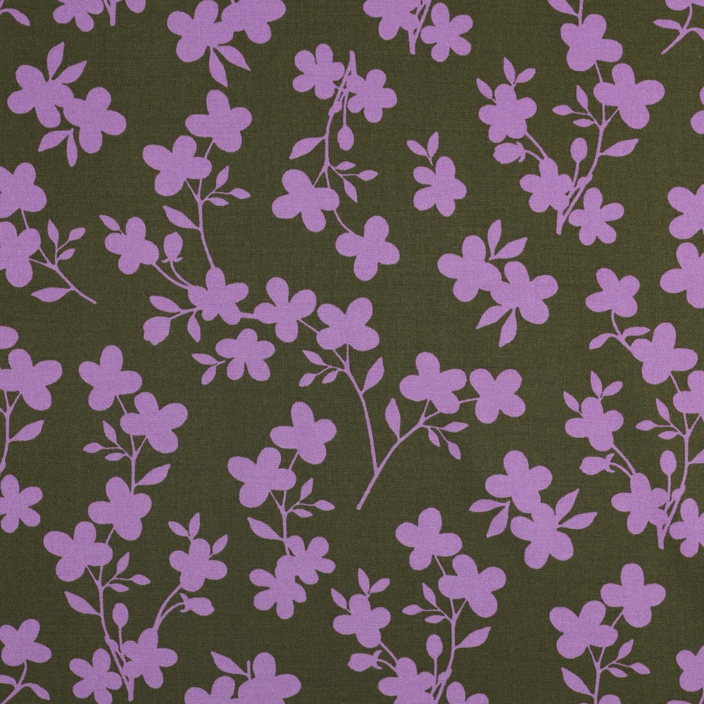 Un delicado toque primaveral: Sobre un tono oliva cálido se enredan finas ramas con pequeñas flores en suave lila y crema. Las ramas filigranas recorren elegantemente la tela y parecen pintadas con pincel – sutil pero impactante.