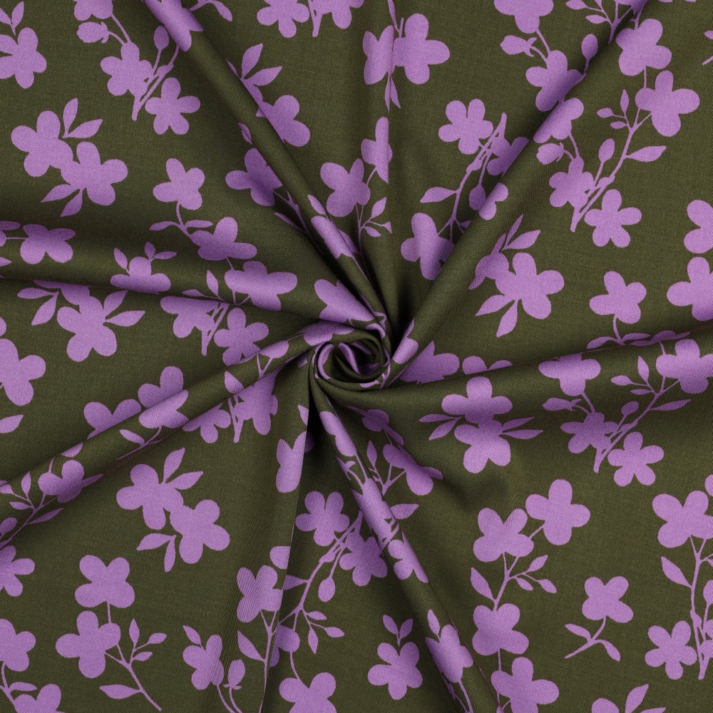 La combinación armoniosa de colores oliva y lila crea una apariencia natural y elegante – perfecta para quienes aman los estampados florales pero prefieren un estilo tranquilo y refinado. Ya sea para el día a día, la oficina o ocasiones especiales: con esta tela se crean prendas favoritas que querrás usar una y otra vez.