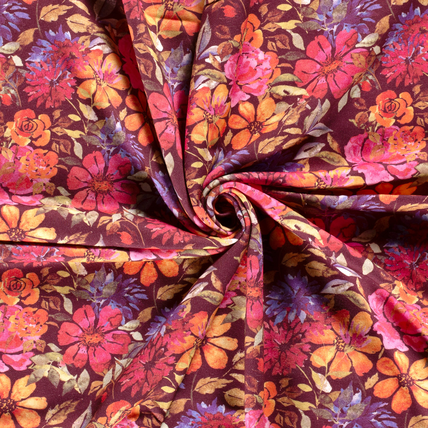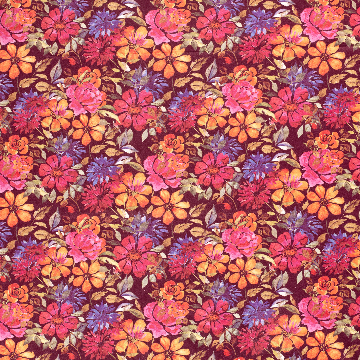 Un tejido de sudadera romántico y encantador que invita inmediatamente a nuevos proyectos de costura: Sobre un rojo burdeos profundo florecen delicadas flores en suaves tonos rosa, crema y beige, entre ellas elegantes hojas en tonos cálidos y apagados. El diseño detallado de estampado digital parece casi pintado y aporta a tus creaciones una apariencia elegante y acogedora.