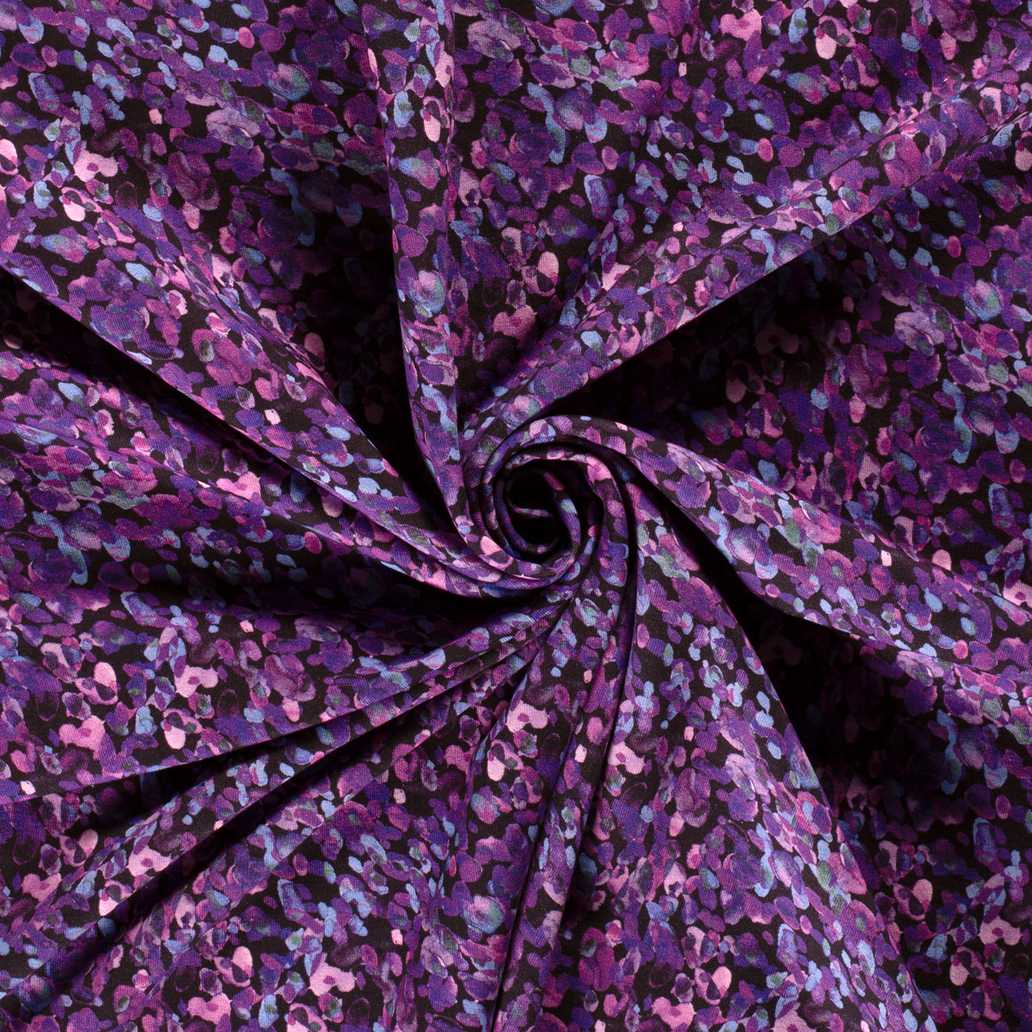 Una tela moderna con un toque artístico: En esta sudadera cepillada se combinan suaves formas en acuarela con apariencia de piedra, creando un patrón abstracto y elegante. Tonos suaves de negro y gris se funden con matices de lila y delicados acentos rosa, como una pintura de acuarela.