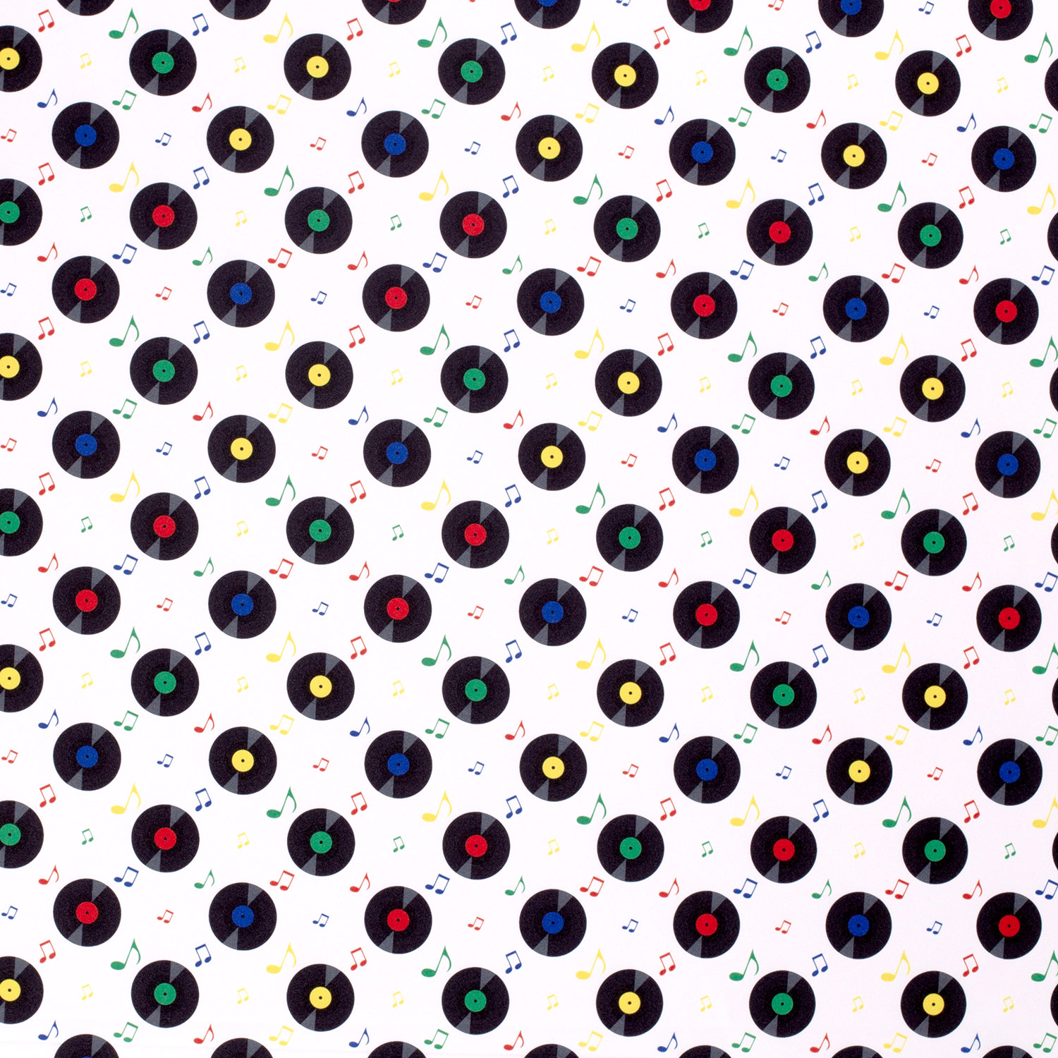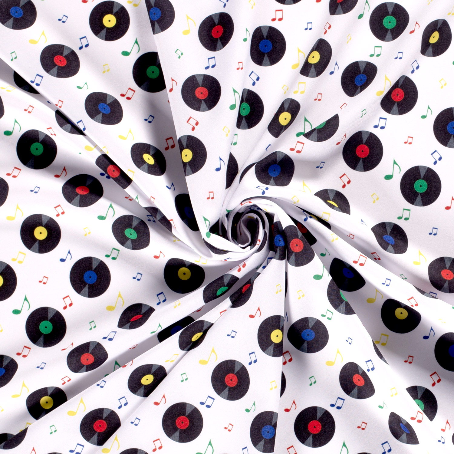 ¡Esta tela de carnaval es un verdadero éxito para todos los amantes de la música! Sobre un fondo blanco brillante, se despliegan discos negros con etiquetas detalladas en rojo intenso y amarillo cálido, como una colorida estantería de discos en tela.