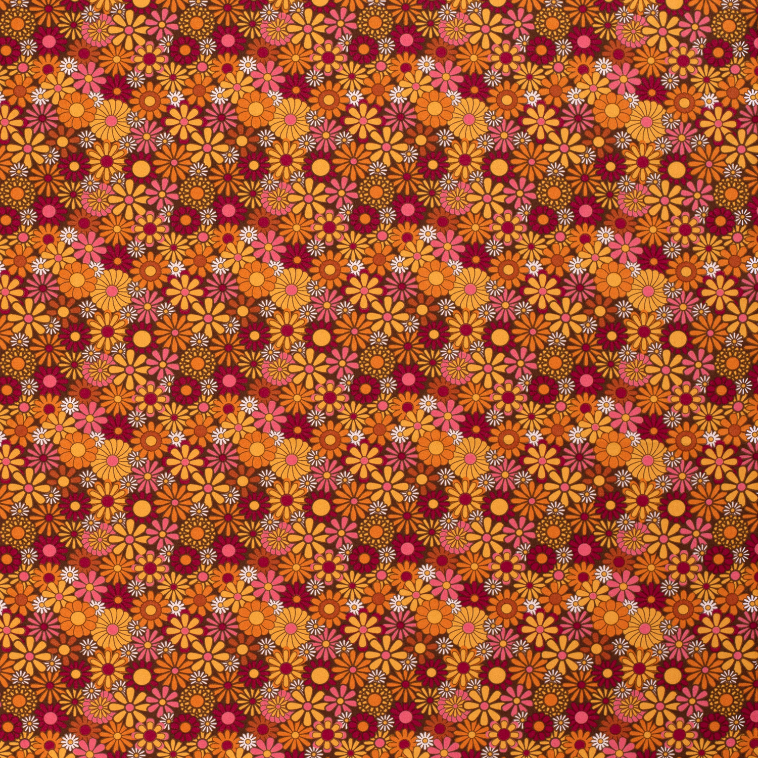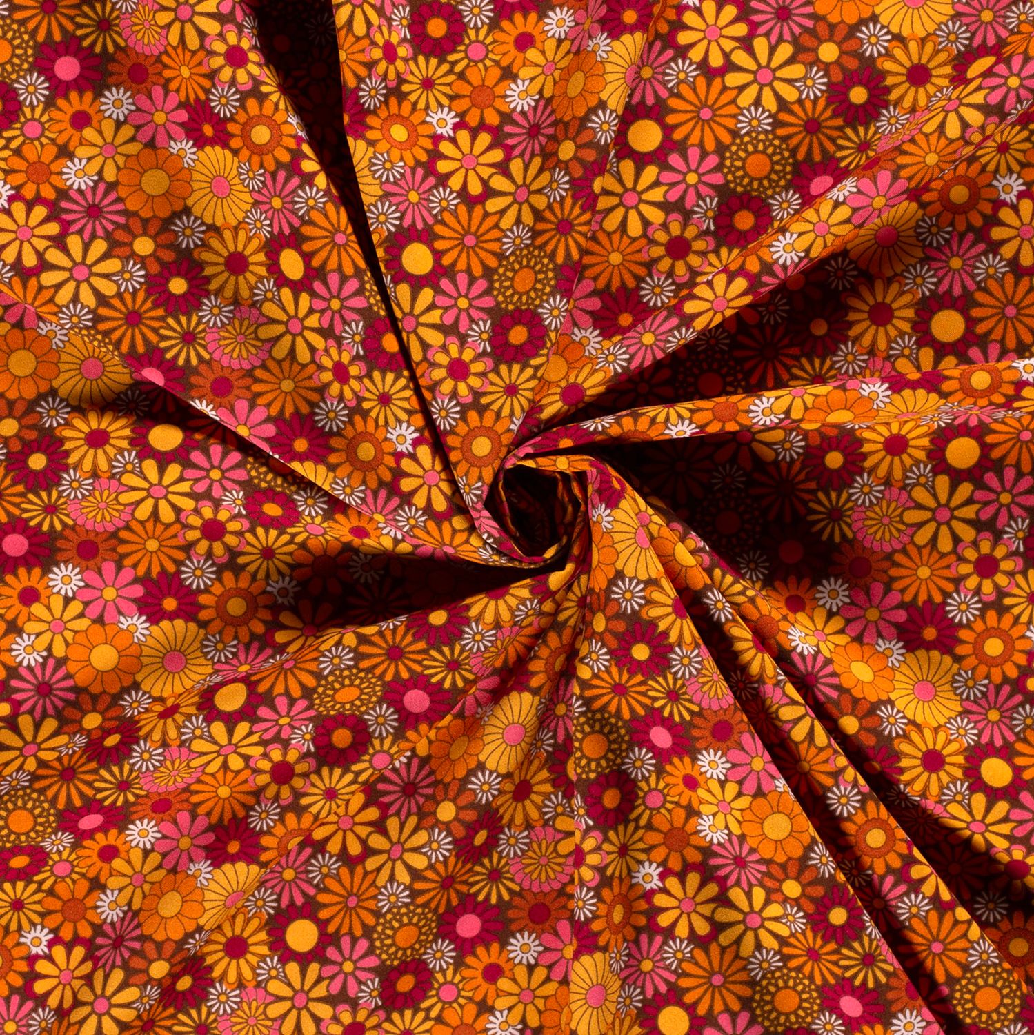 Esta alegre tela de carnaval aporta inmediatamente buen humor a cualquier proyecto de costura: sobre un fondo naranja brillante, se despliegan pequeñas flores estilizadas en colores frescos y vibrantes. El patrón juguetón y repetitivo resulta vivo sin ser recargado, y es perfecto para disfraces llamativos, faldas coloridas, chalecos, capas, accesorios o ideas de decoración para la quinta estación del año.
