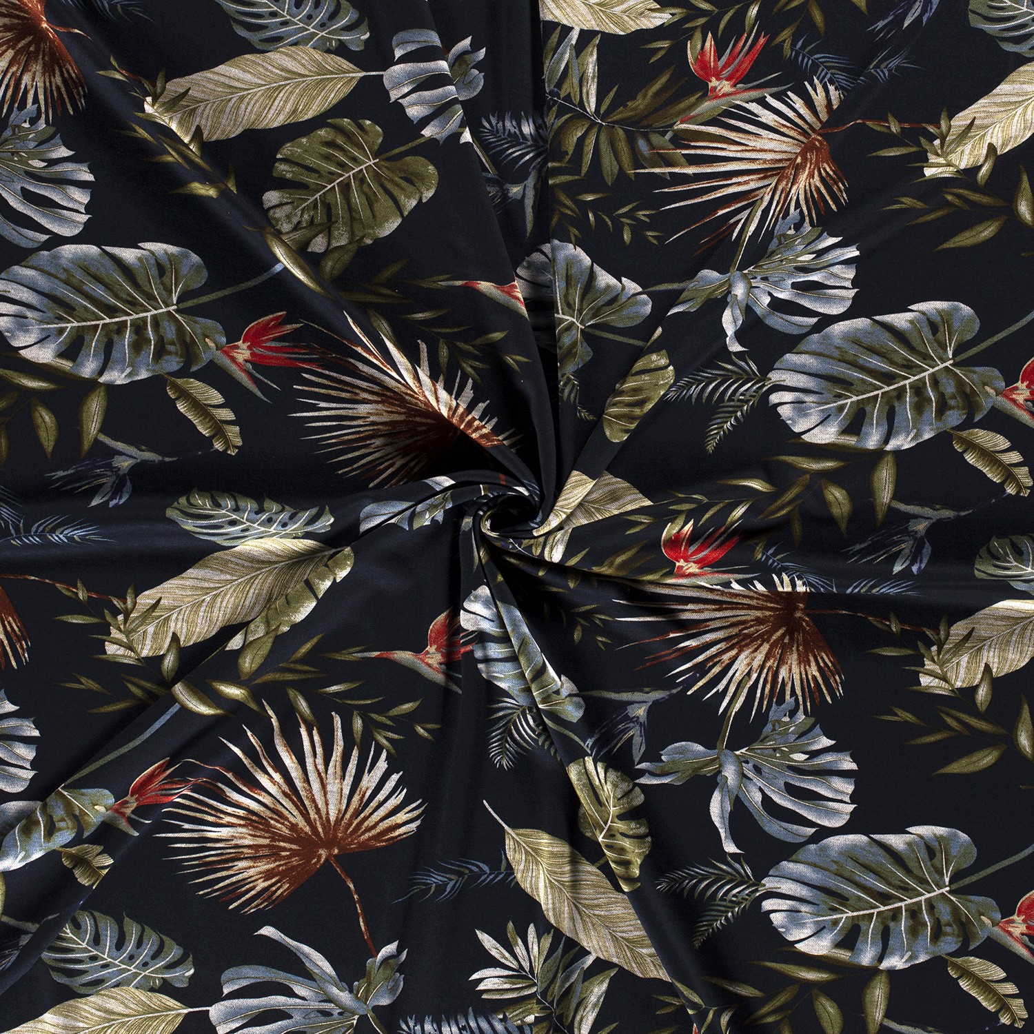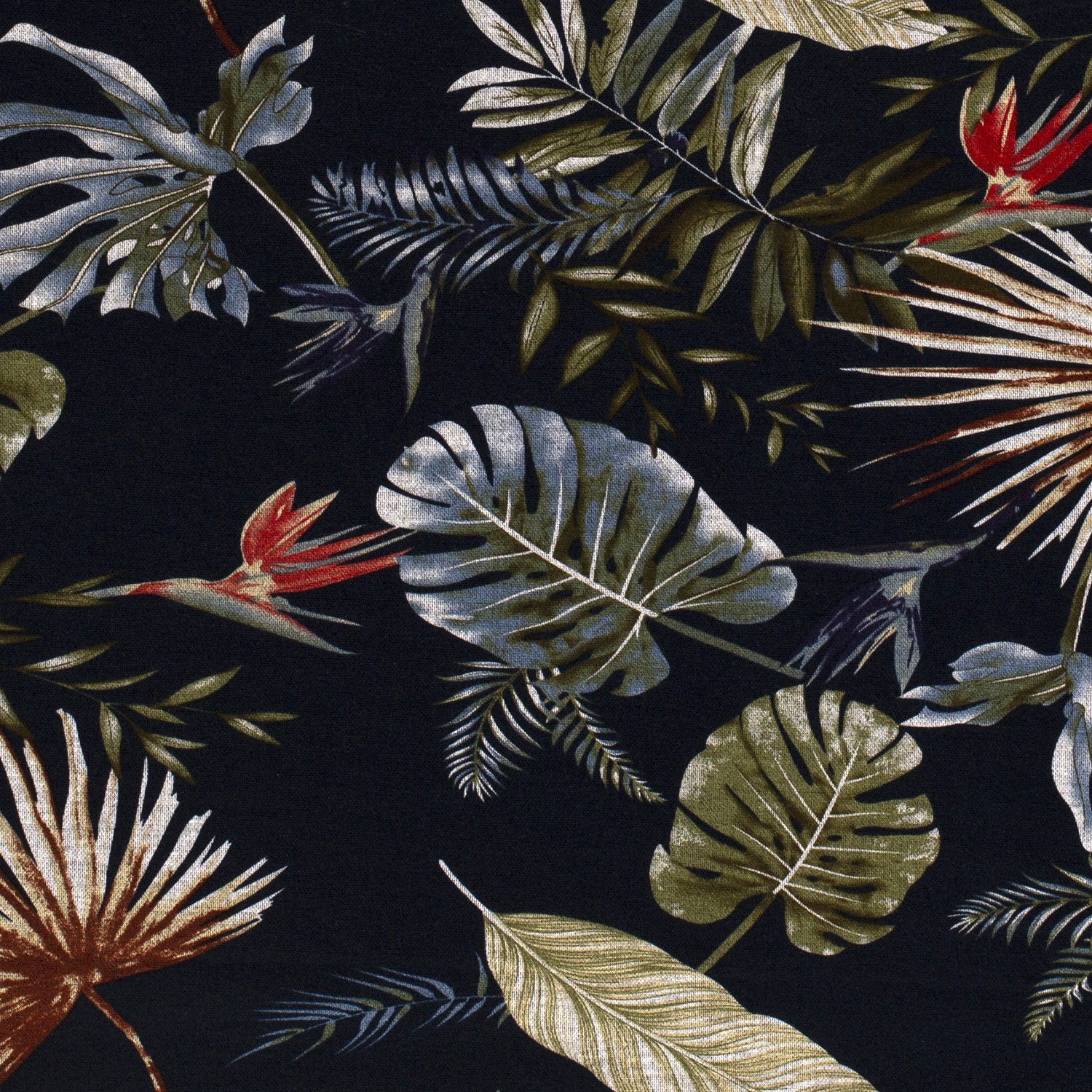 Un toque tropical para tu armario: Sobre un fondo azul marino intenso, se despliegan exuberantes hojas en distintos tonos de verde – desde un suave verde salvia hasta un intenso esmeralda. Entre ellas, finos acentos más claros resaltan las venas de las hojas y le dan al diseño un efecto vivo, casi tridimensional.