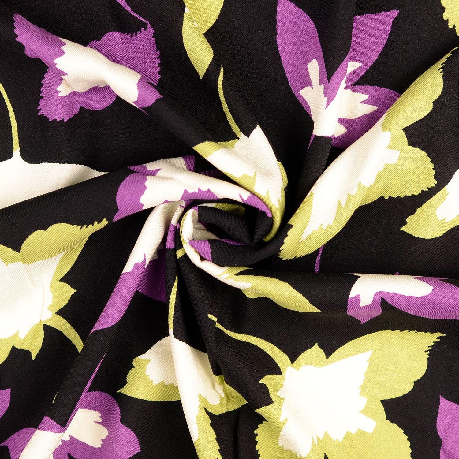 Un sueño elegante de hojas con un estilo gráfico: Sobre un fondo negro intenso, delicadas hojas en un fresco verde claro y tonos naturales suaves se enredan sobre la tela. El fino patrón twill ligeramente diagonal aporta al diseño una estructura noble y una caída preciosa – perfecto para blusas fluidas, vestidos, faldas o pantalones anchos.