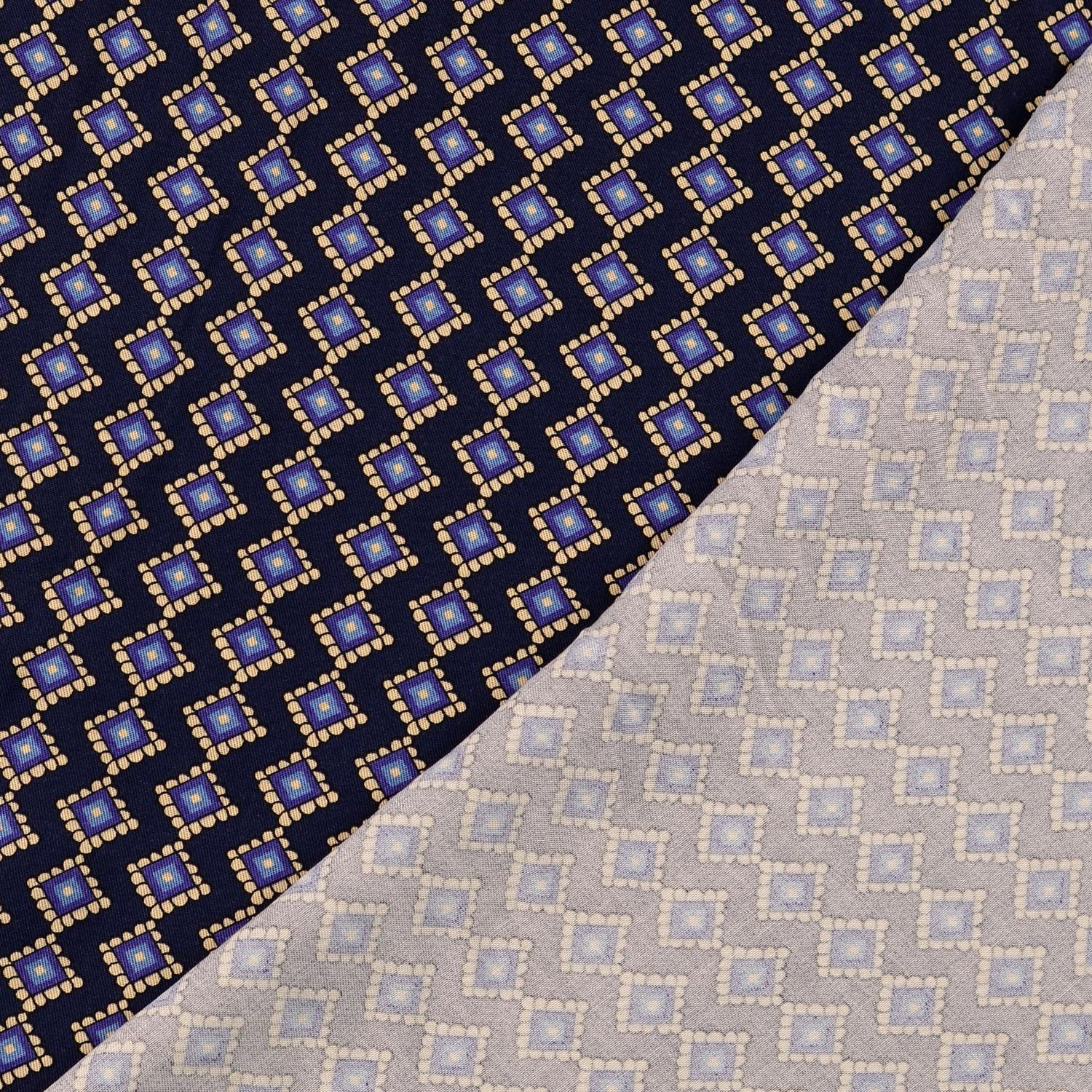 Una tela hecha para piezas favoritas elegantes: sobre un fondo azul marino profundo se alinean finos rombos color crema formando un patrón gráfico claro con una apariencia atemporal. Las líneas estrechas son discretas y elegantes al mismo tiempo, perfecto si te gustan los estampados que llaman la atención sin ser estridentes.