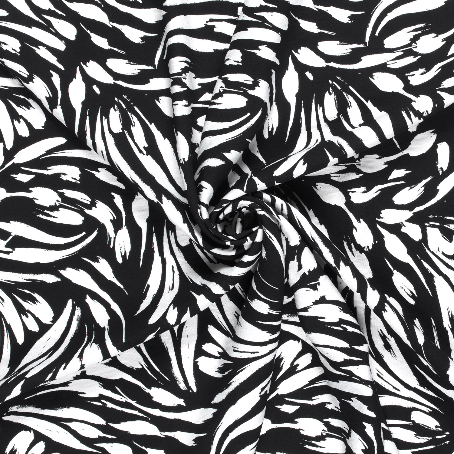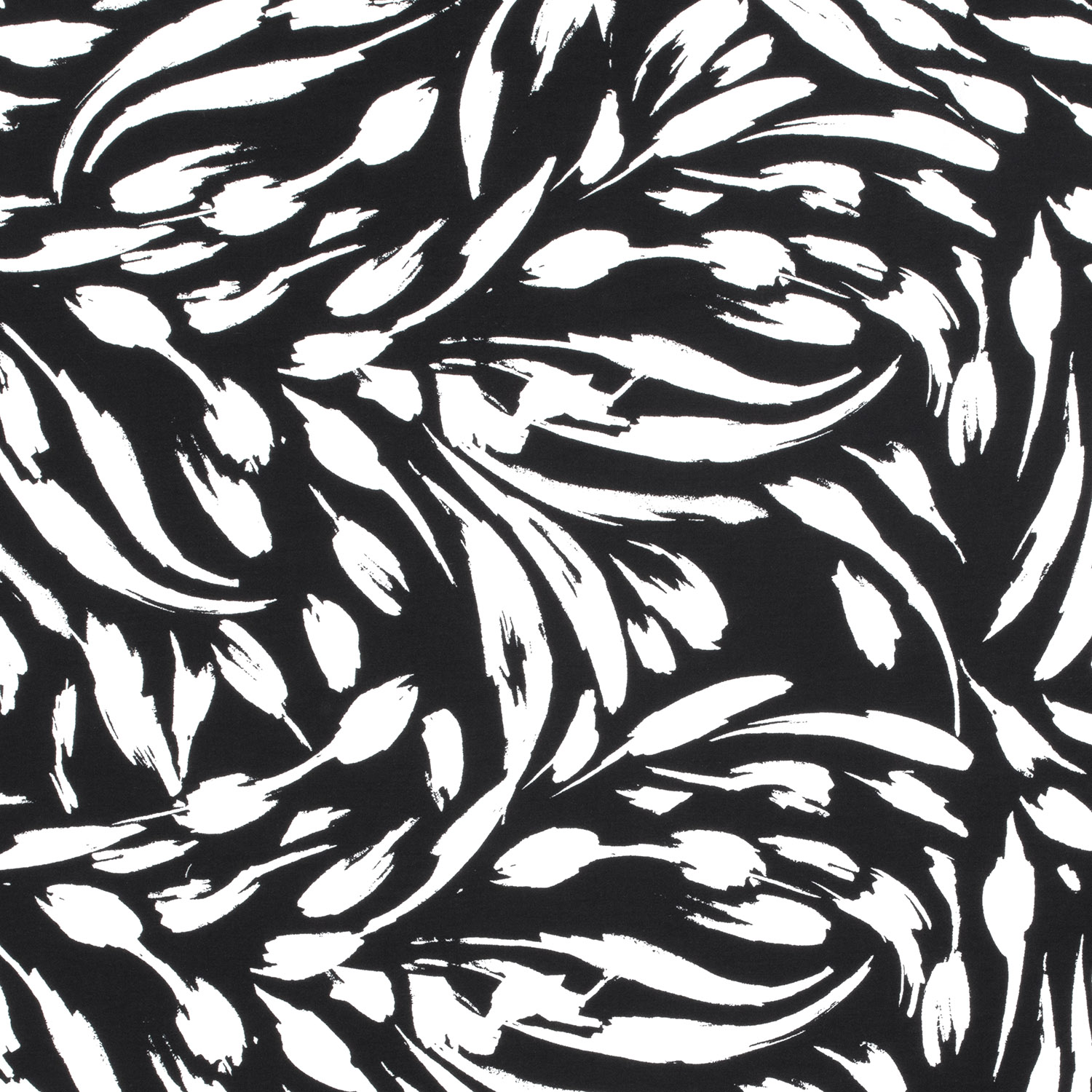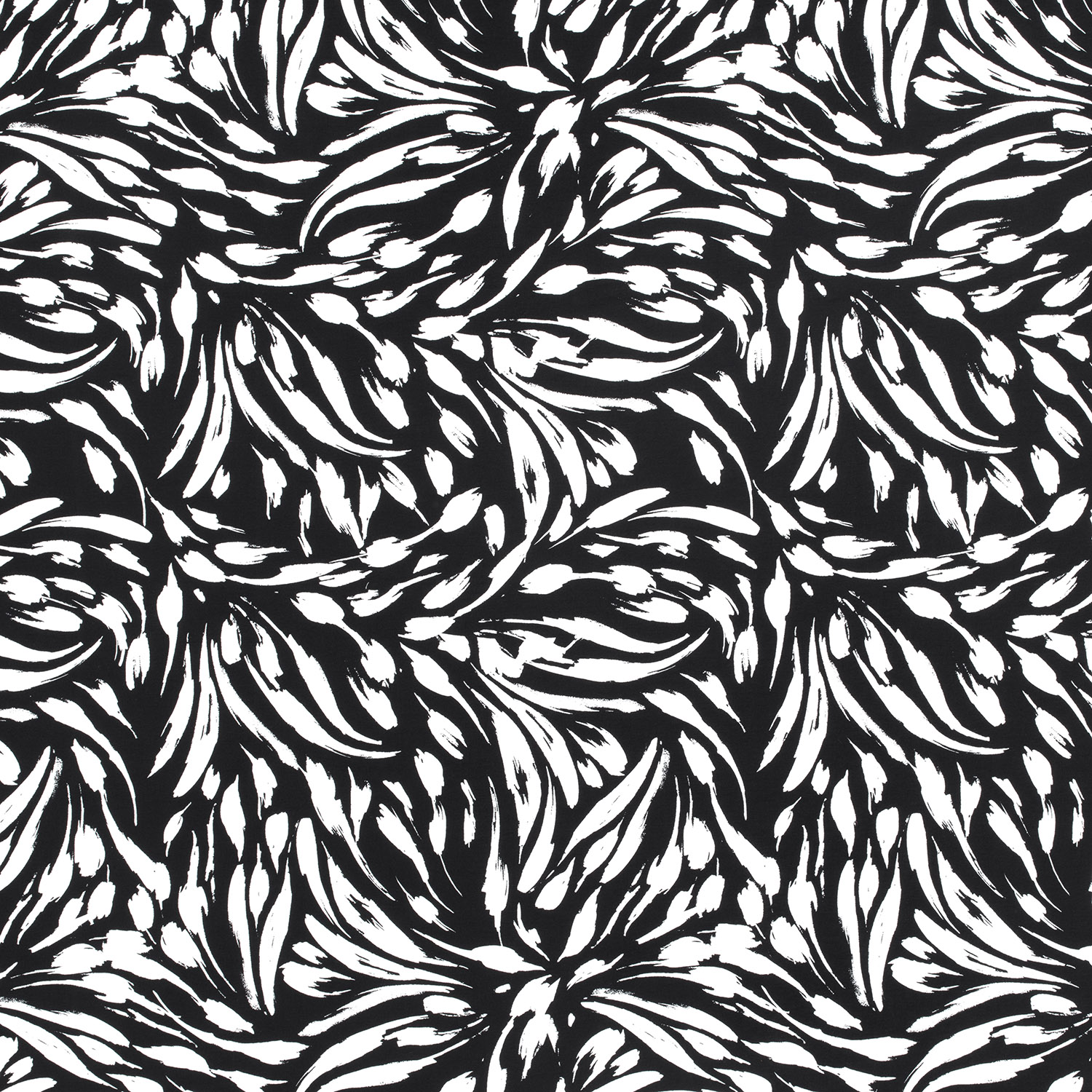 Un sueño floral elegante sobre un fondo negro profundo: Este crepé de viscosa encanta con un diseño estilizado de flores y hojas que recuerda a un jardín nocturno. Flores delicadas en tonos cálidos rosas y rojos, combinadas con finas hojas en tonos naturales apagados, destacan especialmente sobre el fondo oscuro y transmiten una sensación femenina y moderna.