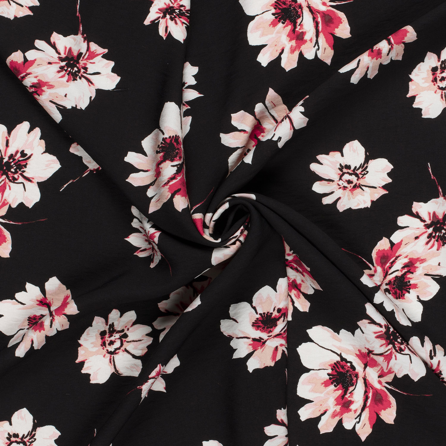 Elegante, femenino y maravillosamente fluido: este crepé de viscosa encanta con un fondo negro profundo, sobre el cual brillan delicadas flores en suaves tonos rosa y beige. Hojas finas en verde discreto y acentos colocados sutilmente hacen que el diseño floral parezca vivo pero no llamativo.