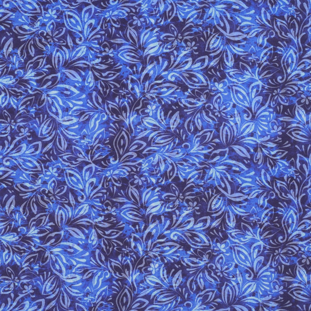 Una tela como un paseo nocturno por un jardín en flor: sobre un fondo azul marino profundo brillan delicadas flores y hojas en tonos naturales armoniosamente combinados. Flores delicadas, finas ramas y hojas detalladamente diseñadas se extienden como una acuarela pintoresca sobre el fondo oscuro, haciendo que los colores resalten con elegancia.