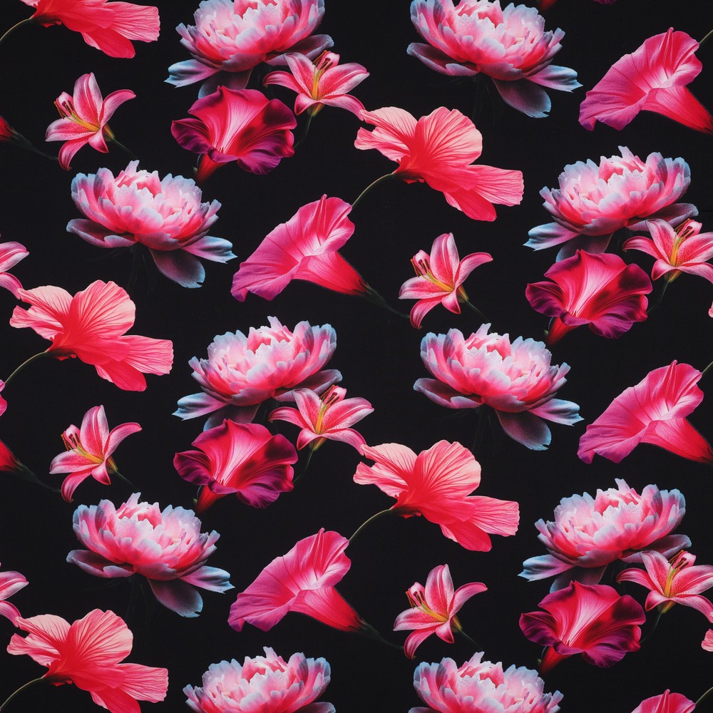 Un toque de elegancia con un giro moderno: Sobre un fondo negro intenso florecen delicadas flores en tonos cálidos rosa y beige, suavemente acompañadas de finas hojas en tonos naturales y grises. El diseño detallado de impresión digital hace que los motivos florales parezcan casi pintados y aporta a cada proyecto de costura una nota estilizada y femenina.