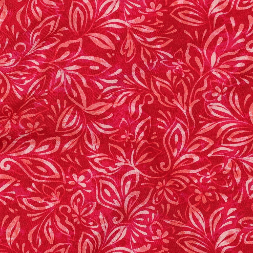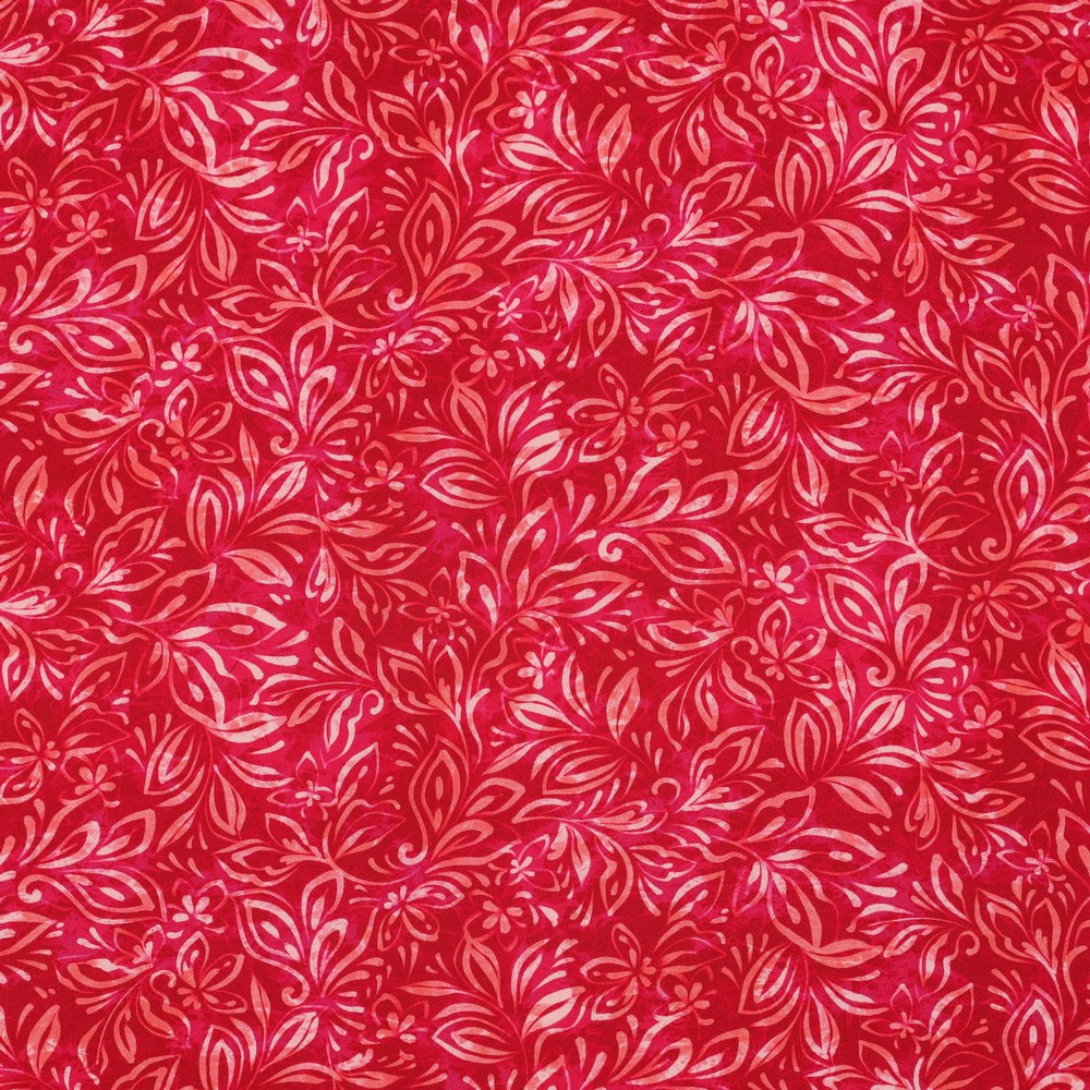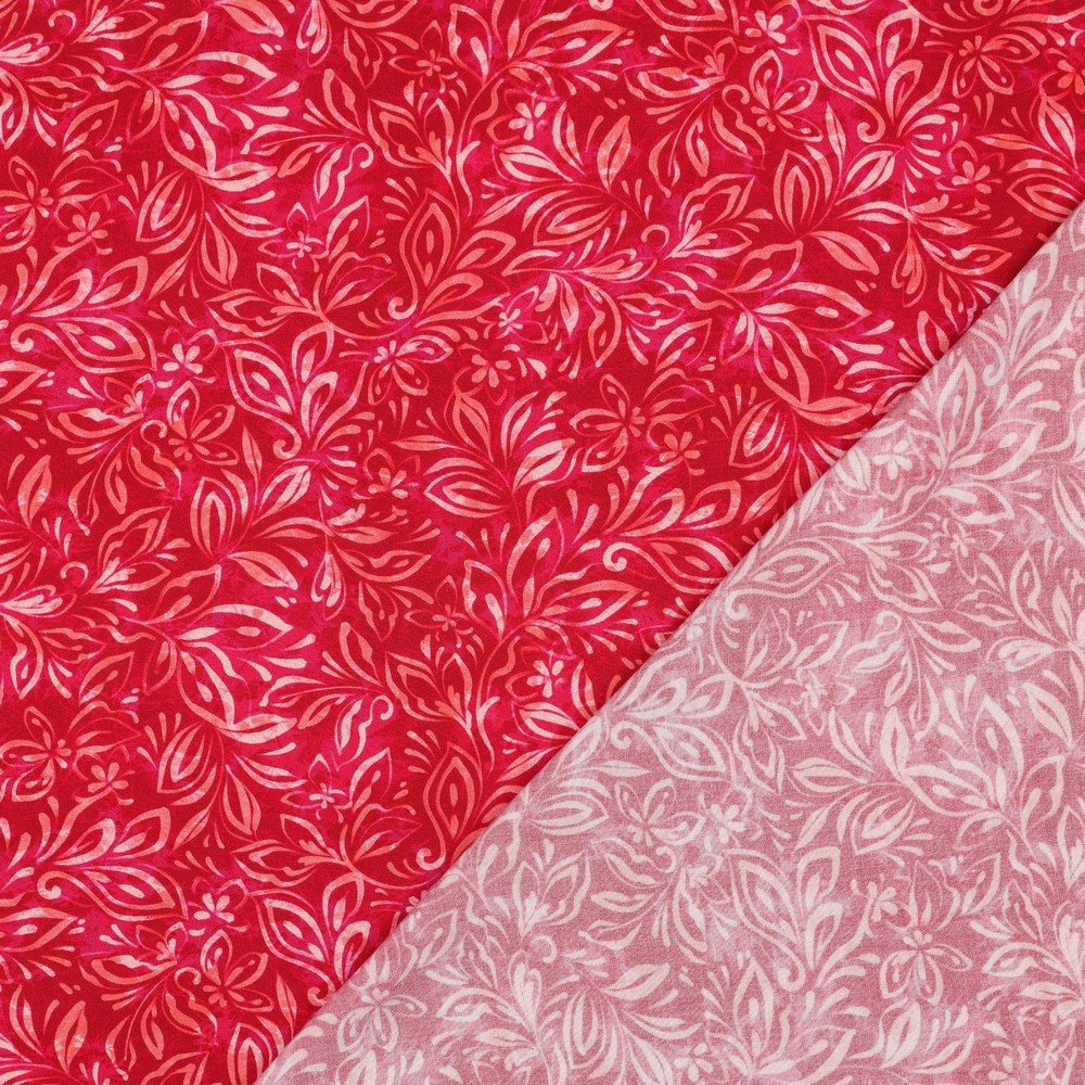 Una tela como un ramo de flores veraniego: Sobre un fondo rojo intenso florecen delicadas flores y hojas en cálidos tonos naturales. Finas hojas en beige, crema y verde se entrelazan elegantemente sobre la tela, mientras pequeñas flores detalladas añaden toques juguetones.