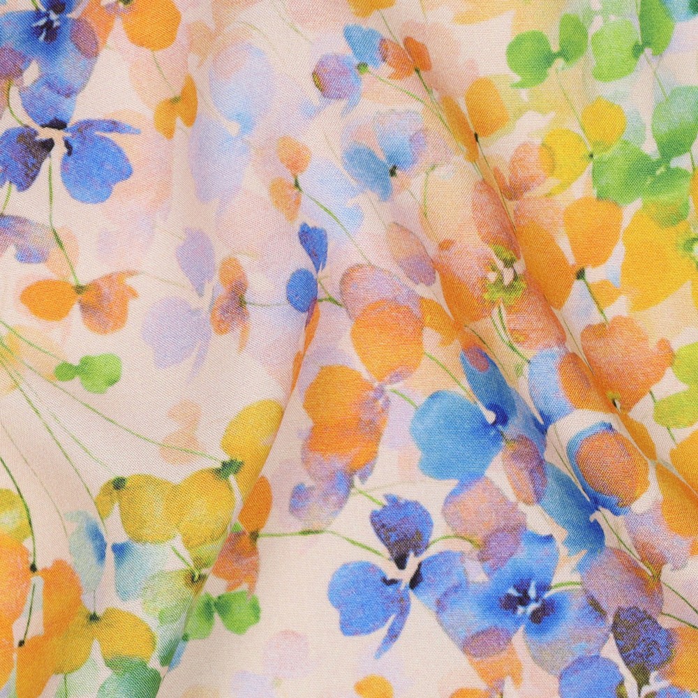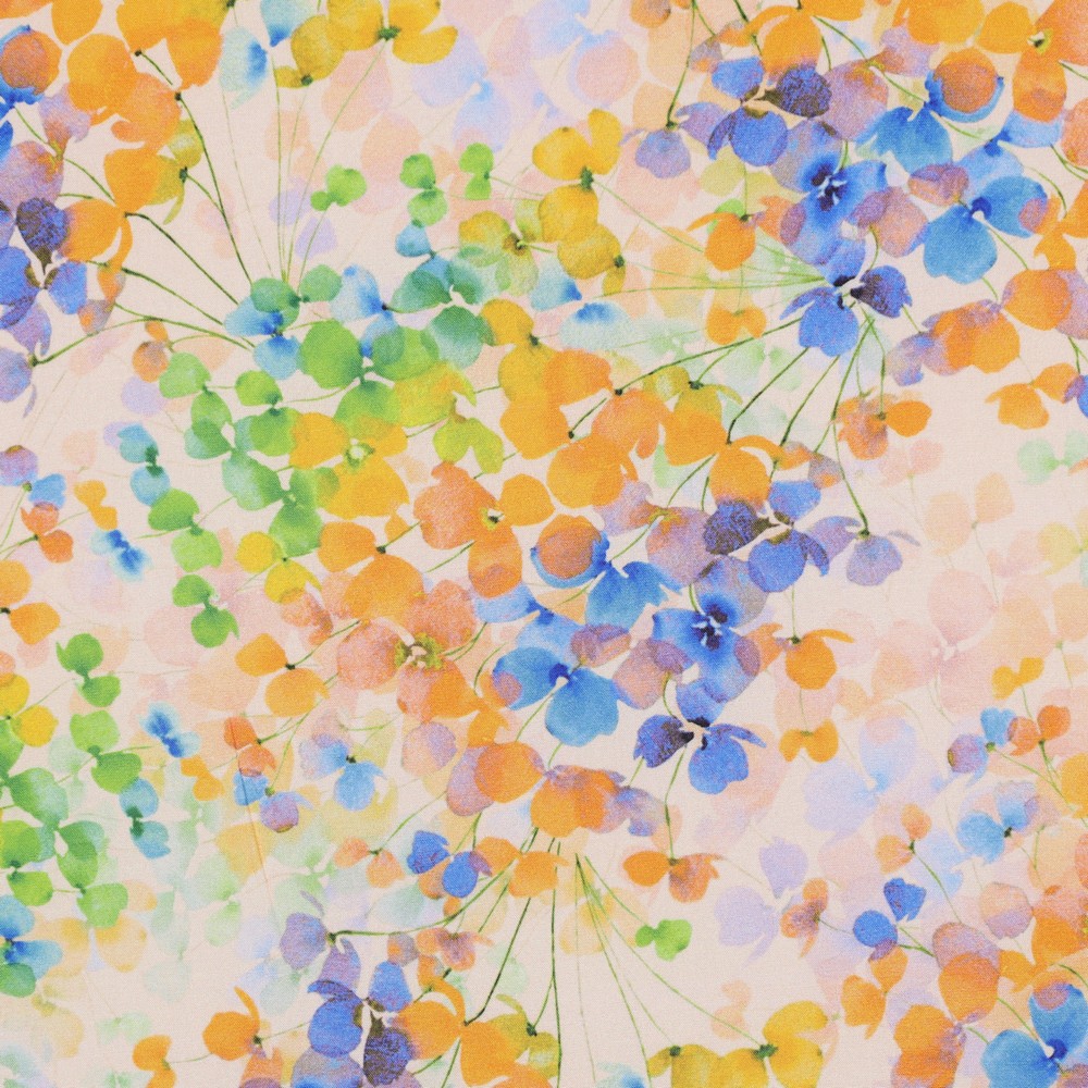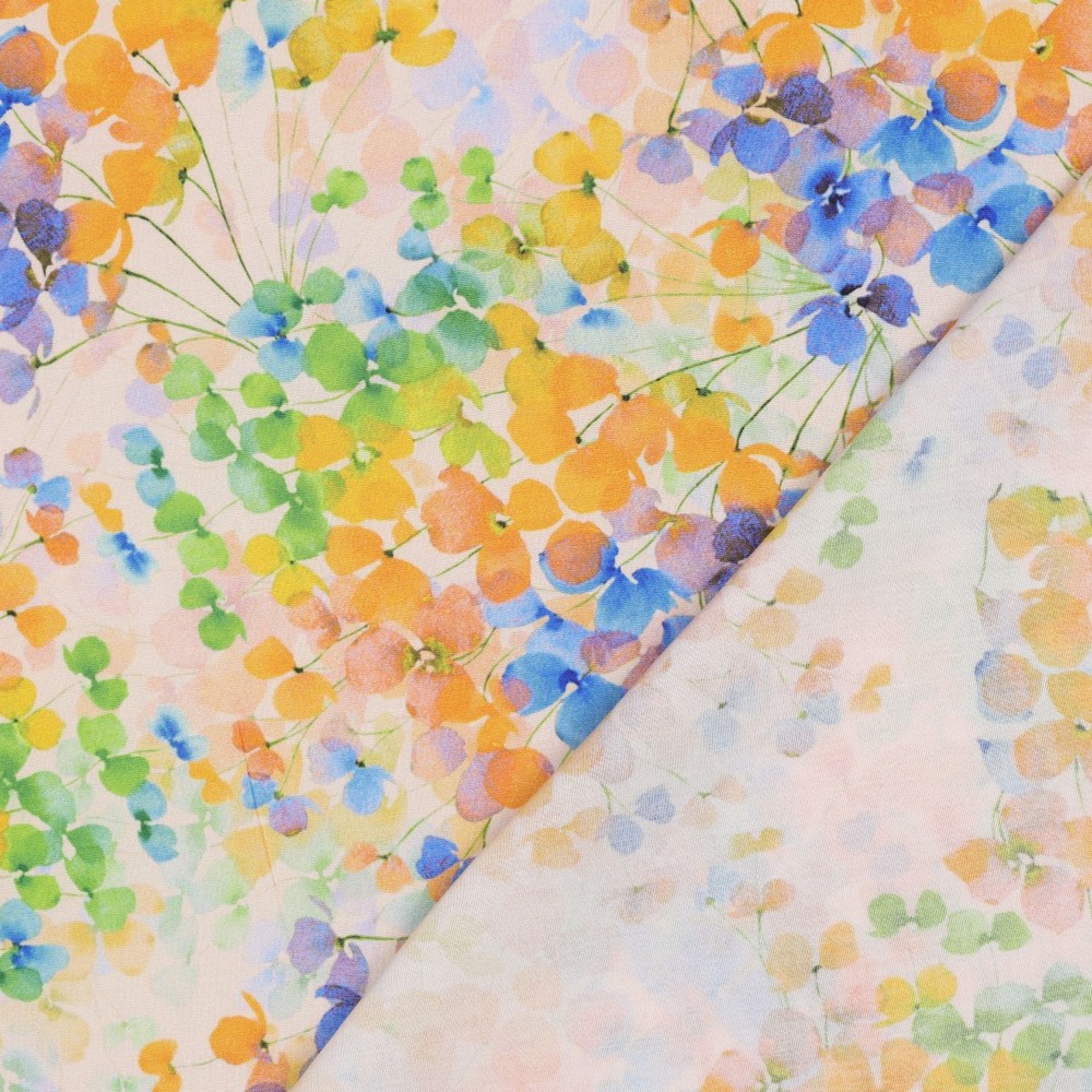 Un delicado sueño de hojas en rosa: Esta tela de viscosa encanta con un diseño vibrante de hojas en tonos multicolor armoniosamente combinados. Suaves matices rosas se encuentran con acentos frescos y coloridos – como un paseo por un jardín de verano en flor.