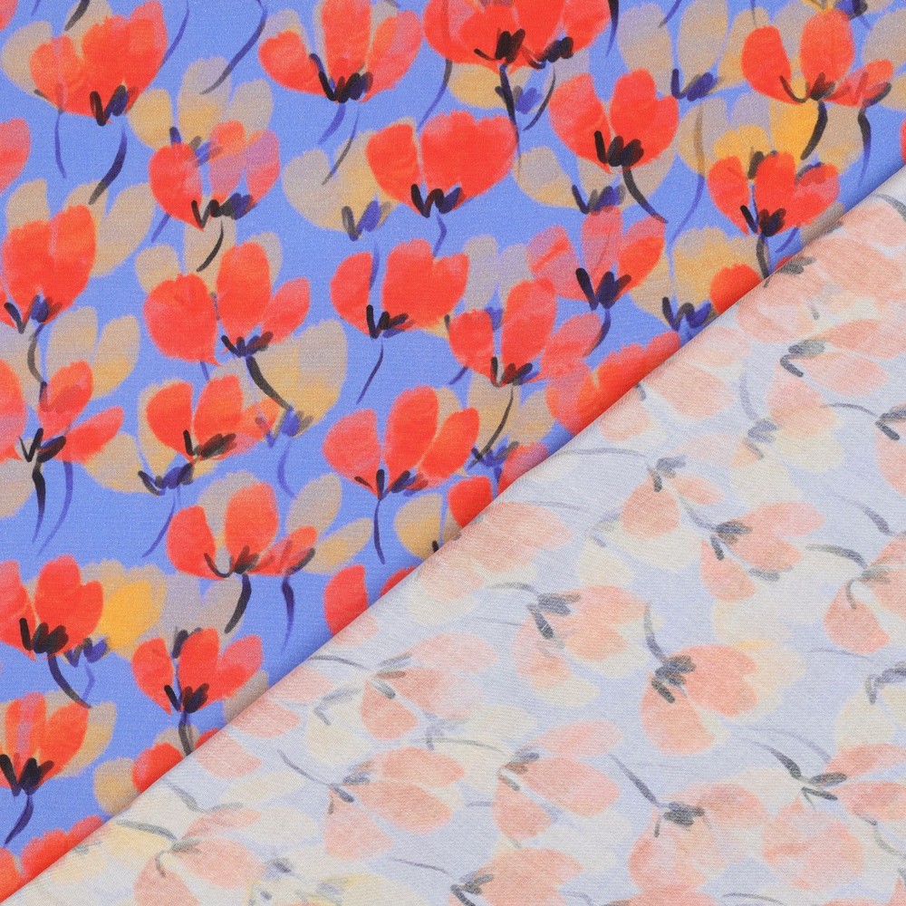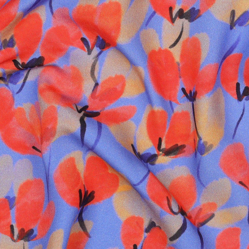 Un mar de flores brillantes: Esta tela de viscosa encanta con un estampado floral colorido sobre un fondo azul profundo. Flores delicadas en rojo intenso, naranja cálido y blanco fresco bailan sobre la tela, entre hojas finas y pequeños acentos florales que dan vitalidad y profundidad al diseño.