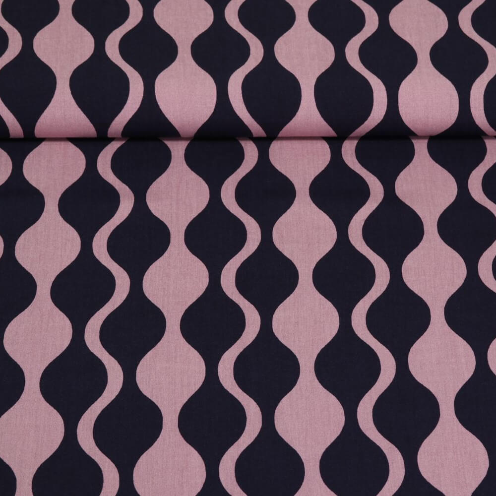 Sumérgete en el encanto de décadas pasadas: este tejido de viscosa deleita con un elegante estampado de ondas retro en azul marino intenso. Las líneas curvas recuerdan las suaves olas del océano y confieren al diseño un aspecto vivo pero tranquilo.